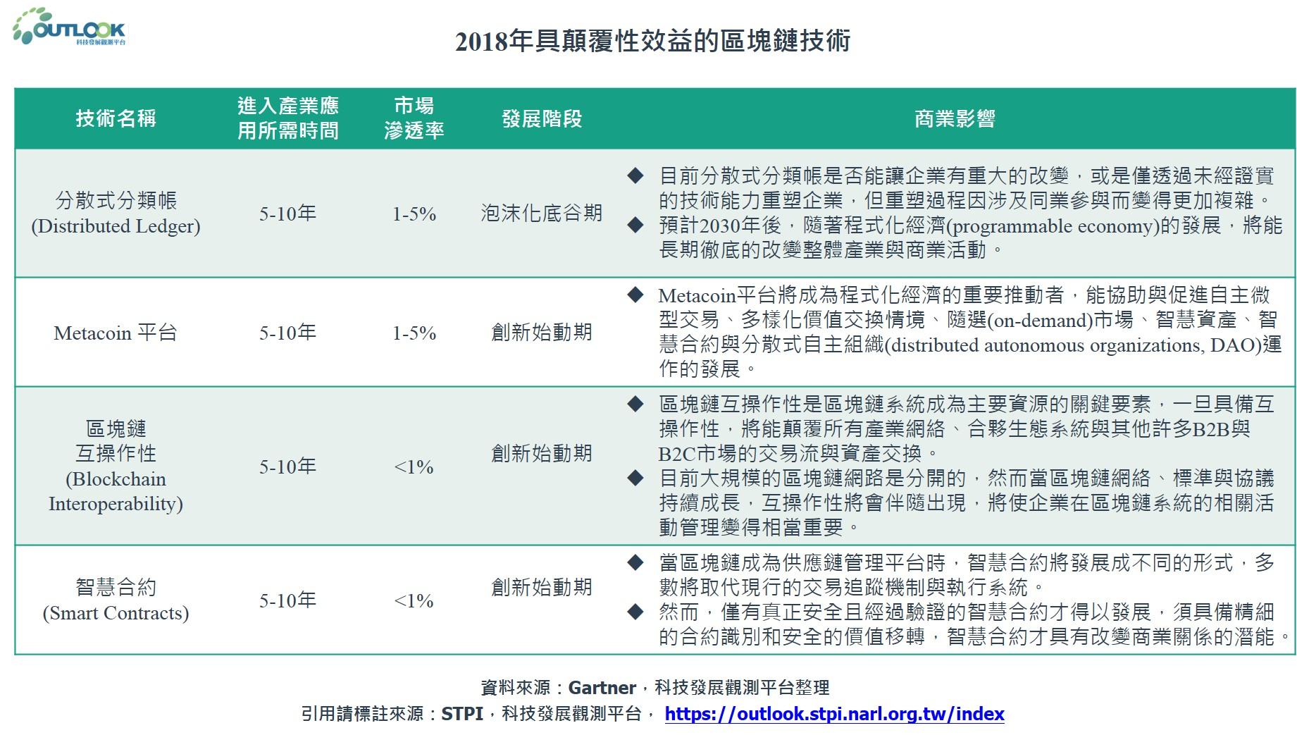 Gartner報告顯示,即使許多地區與產業對於區塊鏈能解決市場低效率、成本與延遲性而保有高度興趣,但以目前的技術成熟曲線看來,離實現市場仍有一段距離,且多數技術仍需5-10年的時間才能被產業應用。
